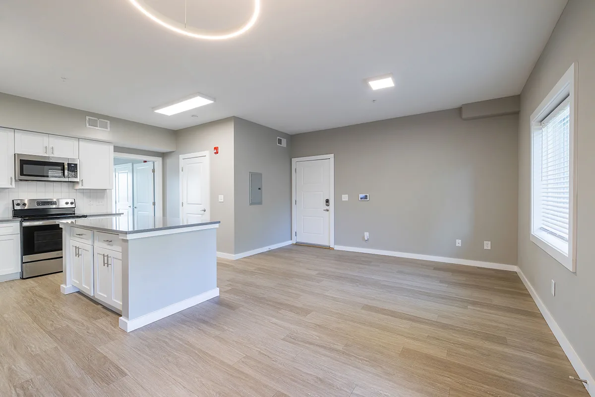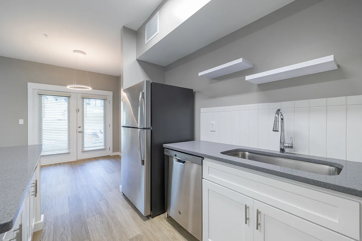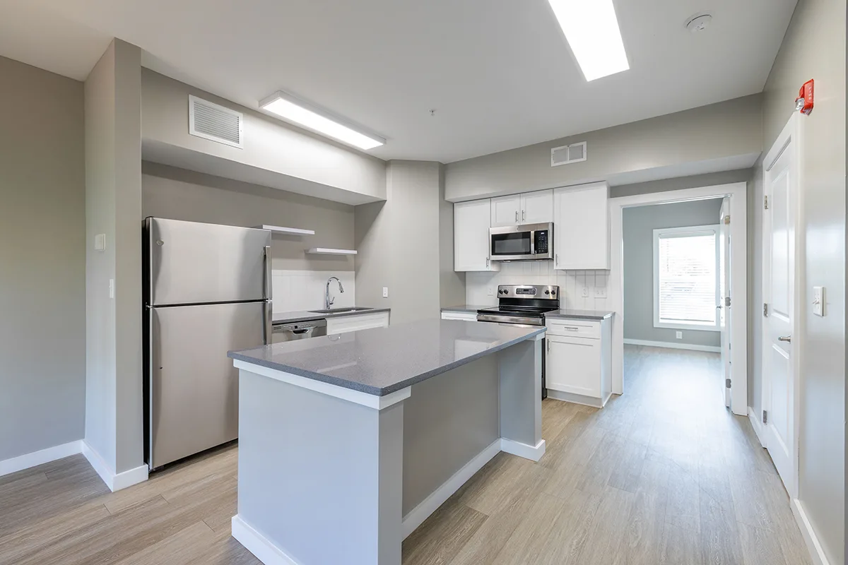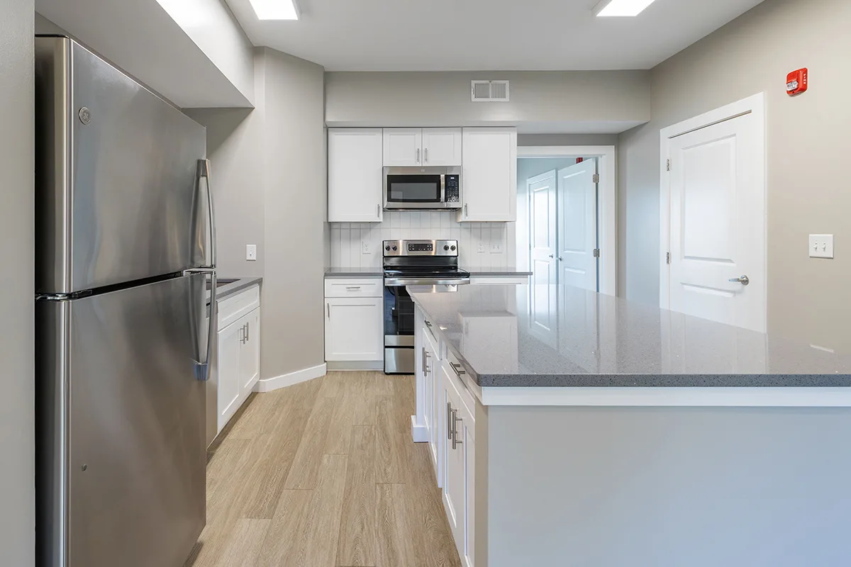 All units come with stainless steel refrigerator, range, microwave, and dishwasher